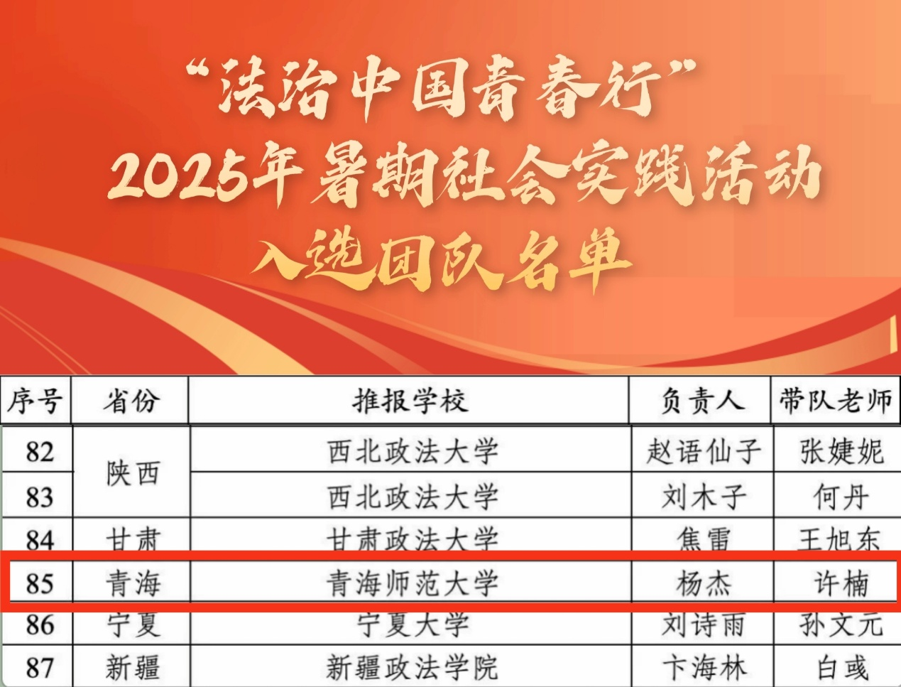 经主办方认真评审,在全国高校范围内共遴选出87支团队,我校法社学院“法行千重青”实践团队成功入选!也是我校团队继去年入选团中央“法治中国青春行”社会实践专项活动名单后,再次以全省唯一高校团队入选!